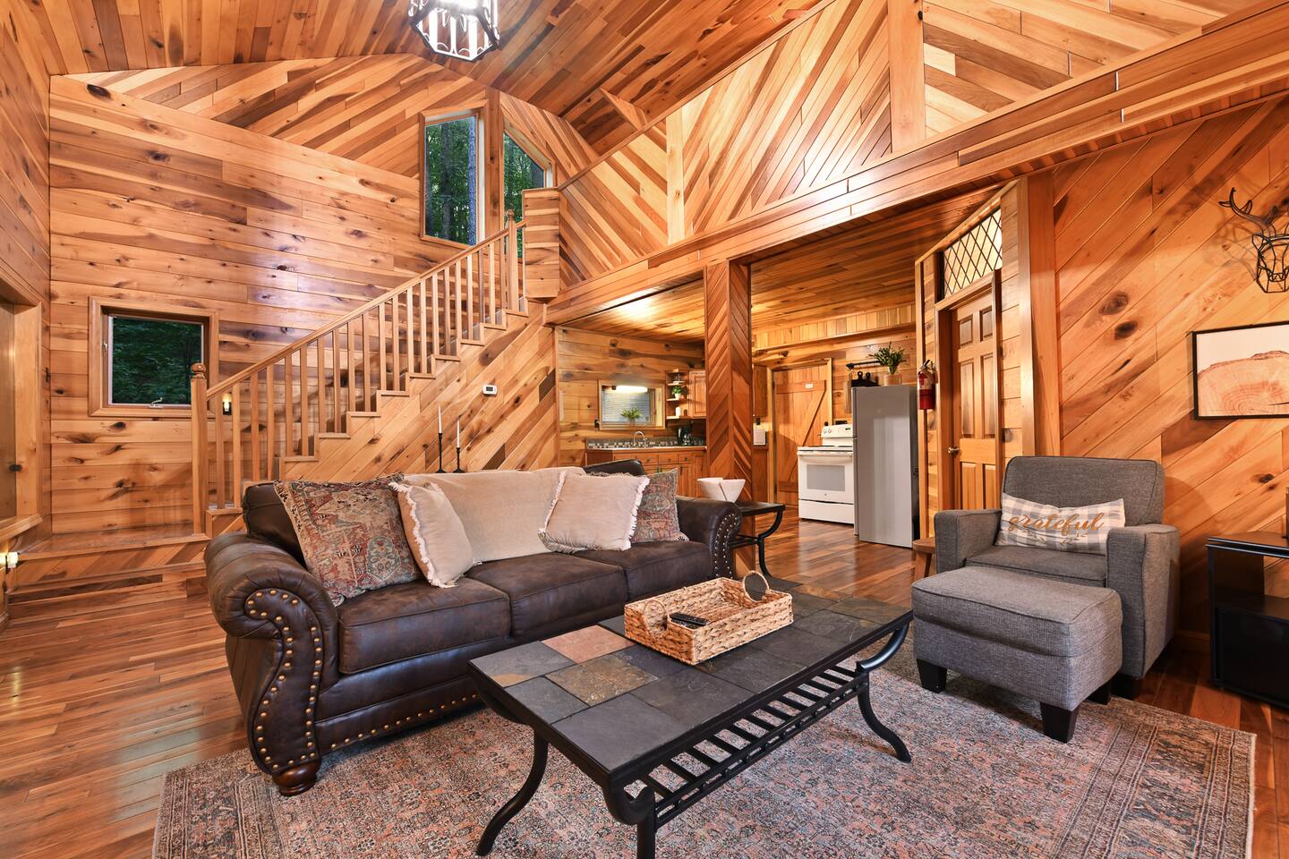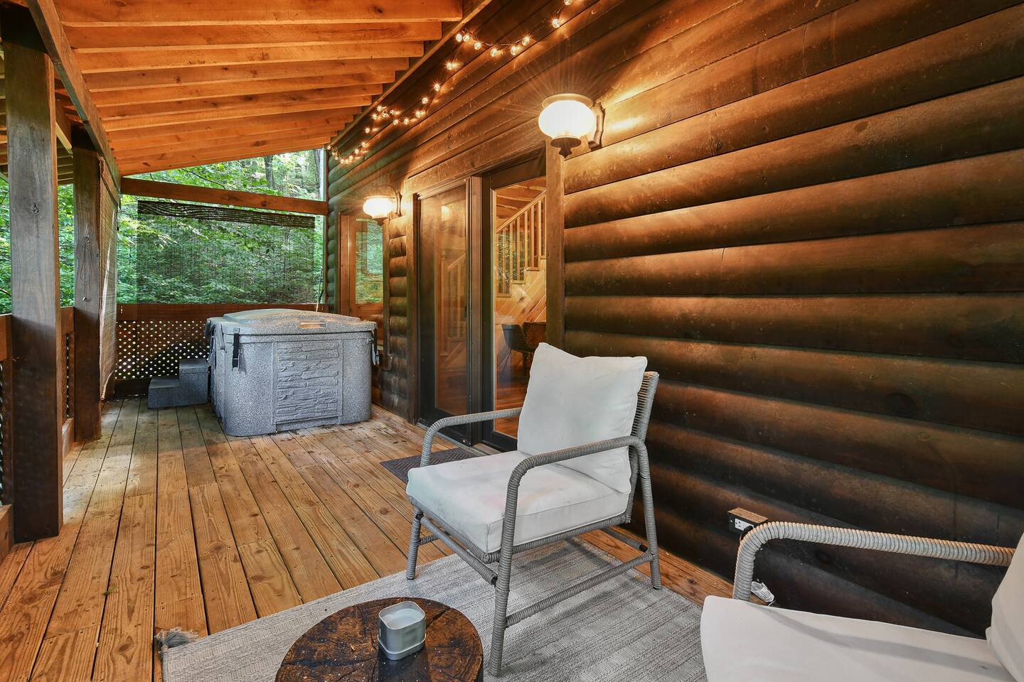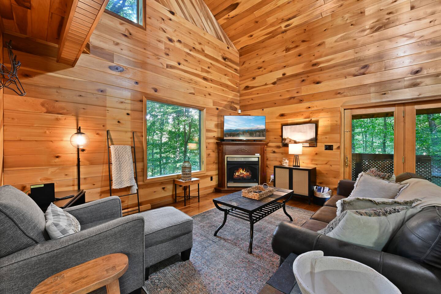 This beautiful one bedroom cabin is the perfect escape from the city! Nestled in the woods of Hocking Hills sits your next vacation spot! This secluded cabin is a 1 bedroom 2 bath with plenty of space to explore and enjoy each others company. Grill outside and enjoy the nature around you or head in to the full stocked kitchen to enjoy your meals. High speed internet allows you to cuddle up on the couch and stream your favorite movies or shows. Turn off the TV grab a glass of wine and enjoy your night in front of the fireplace! Head upstairs to the bedroom with a beautiful log bed and private bathroom! or out back to enjoy the hot tub and the sounds of nature all around you! Secluded in the woods but so close to all the amazing attractions Hocking Hills has to offer. Rock House is just 5 minutes away, Zip Lining, Hiking, Horseback riding all within 30 minutes of the cabin! We are pet friendly with a pet fee. Our driveway is steep, we recommend using 4WD cars only in the winter months. Check out what some of our guests have said: "Loved it! Can’t wait to stay again!" "Charming little spot in the woods and very close to some amazing hikes! We stopped here on our way through the area and wished we could’ve stayed longer! Very relaxing vibe and very clean, hot tub was a bonus. If we’re ever in the area again we will look to book here!" "SO PRETTY. It’s perfect cabin but modern and updated vibes. The hot tub was dreamy!" "This was the best couples cabin my husband and I have stayed at in hocking hills! Clean, private, and cozy, this place had everything we needed. Rock House, conkle’s hollow, and old man’s cave are close drives. The views all around the cabin are beautiful and we enjoyed many walks with our dog. We would definitely choose this cabin again!"